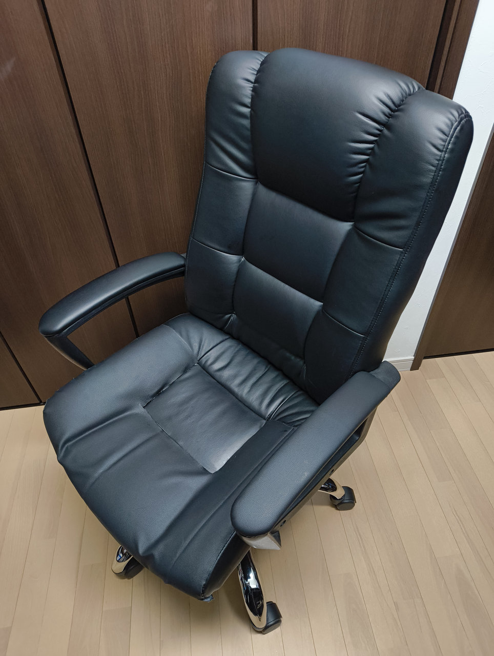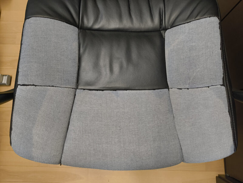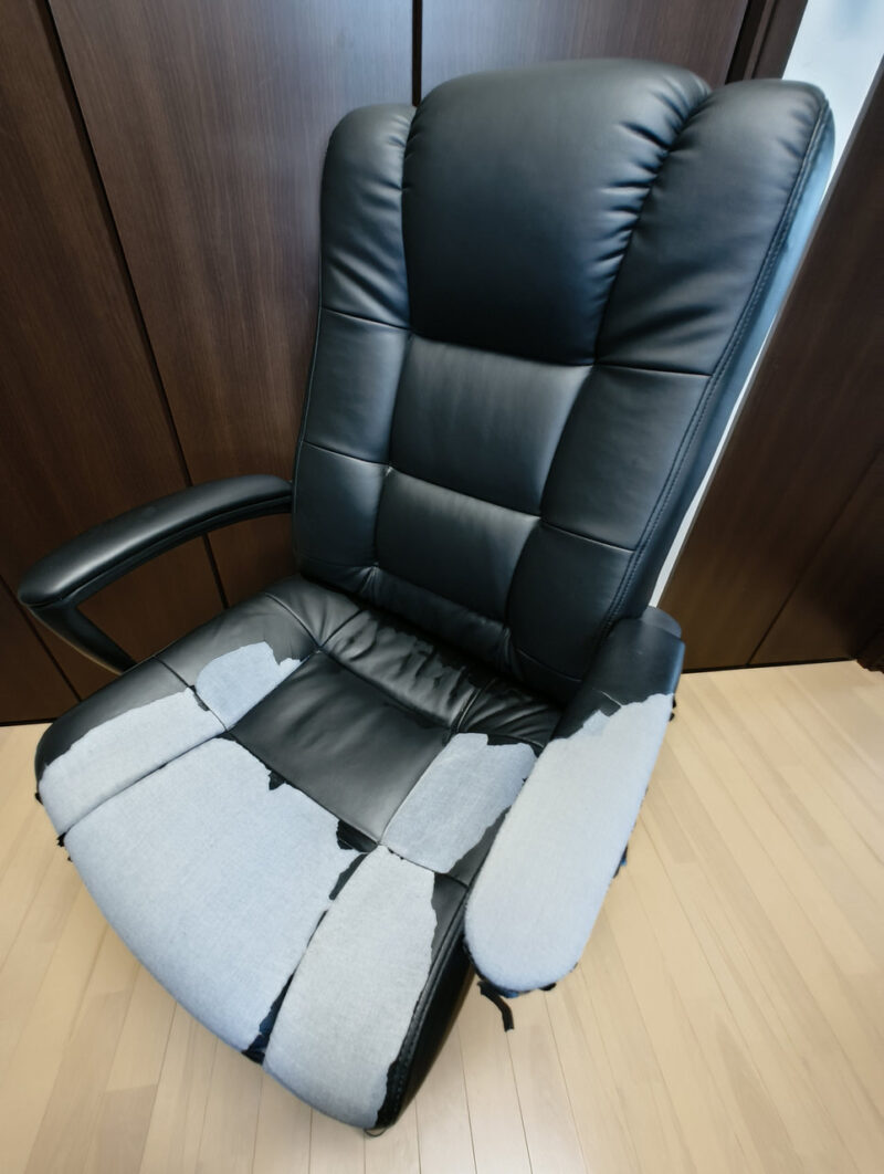かつては、ご主人の日々の奮闘を優しく、時には力強く受け止めていた、このPCチェア。 しかし、長年の激務に耐えかね、いつしか合皮の表面は擦り切れ、座面には痛々しい裂け目が縦横無尽に走るようになっていました。