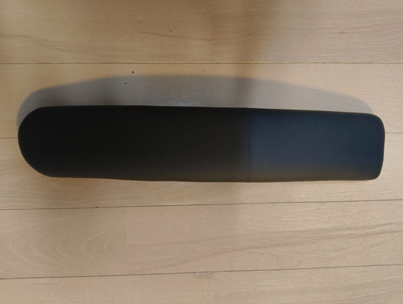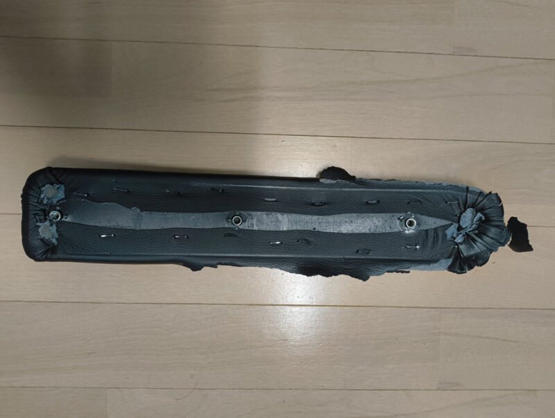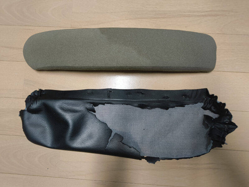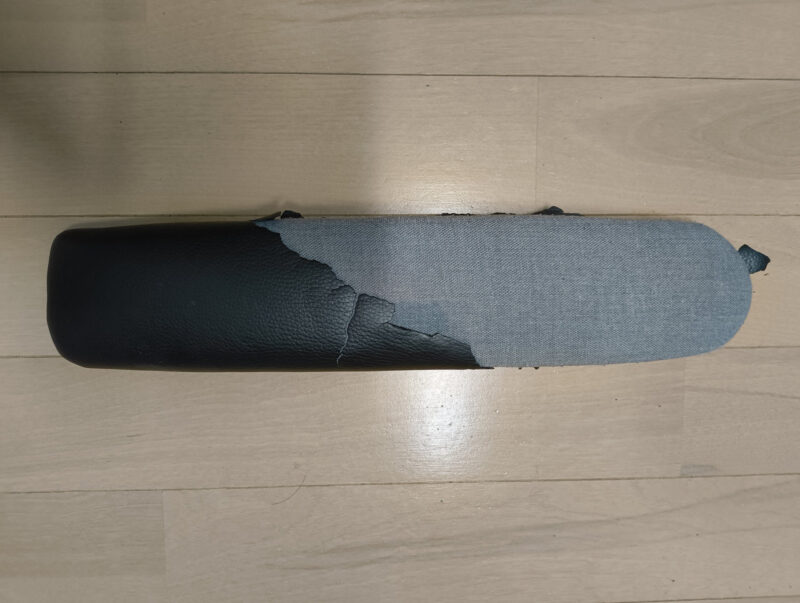 さらに、主人の左腕を長年支え続けてきた「左側のひじ掛け」。ここもまた、摩擦と経年劣化により合皮が剥がれ、無残な姿を晒していました。