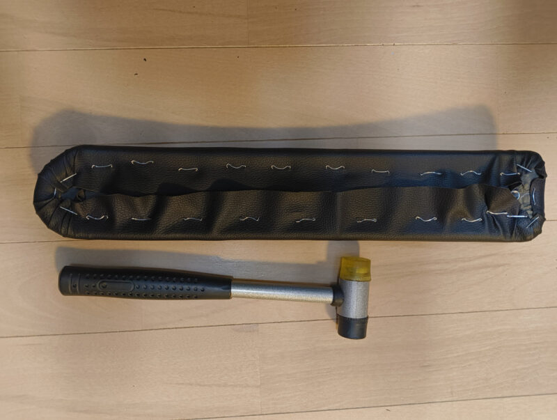 執念の打ち込み: しかし、タッカーの力が弱いのか、針が奥まで刺さりきりません。ここで匠はレザークラフト用のハンマーを取り出し、一本一本、確実な打撃で針を打ち込んでいったのです。
