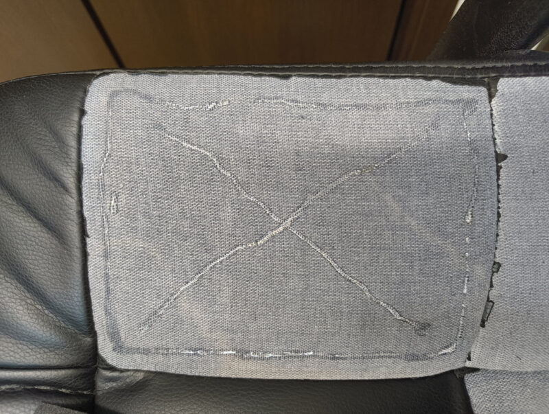 ひじ掛けでの勝利の余韻に浸る間もなく、匠は最大の難関、座面へと向かいます。 しかし、ここで最大の誤算が。届いたのはシールではない「ただの合皮」。匠は急遽、部分補修という精密な作戦へと切り替えました。