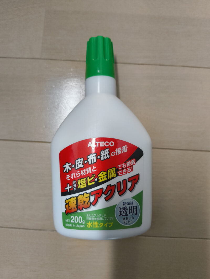 接着剤のバトンリレー: 座面奥から前方へ、「セメダイン(超多用途)」で丹念に貼り進める匠。しかし、無情にもその雫は途絶えました。すかさず投入されたのは、急遽買い足した「ALTECO 速乾アクリア」。二つの個性が、一枚のシートを支えます。
