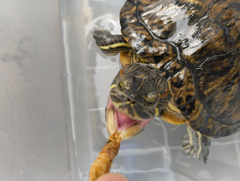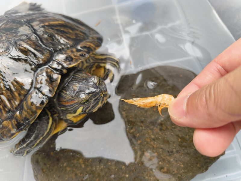 スッキリしてお腹が空いたのか、勢いよくエサの乾燥エビに食いつきます。